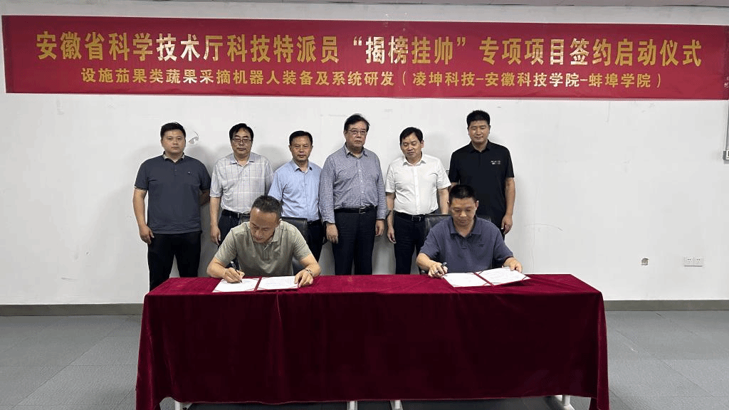 安徽省科学技术厅科技特派员“揭榜挂帅”农业物质技术装备专项项目,属于安徽省科技重大专项项目,我校机械工程学院材料成形及智能装备团队申报的“设施茄果类蔬果智能采摘机器人装备及系统研发”获批立项,这也是华体平台首次获批省级揭榜挂帅项目;该项目省级支持资金100万,地方按照1:1配套资金。6月2日,发榜方和揭榜方在安徽凌坤智能科技有限公司举行项目启动和各方责任履约签约仪式,蚌埠市科技局副局长杨怀波、华体平台科研处处长陈丰、安徽凌坤智能科技有限公司董事长潘成刚等参加签约启动仪式。