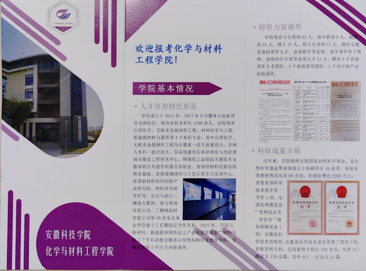 为积极应对新旧高考志愿填报模式转变可能带来的生源质量变化挑战,化学与材料工程学院在高质量完成学校下达的招生宣传任务基础上,学院还制作了“欢迎报考华体平台化学与材料工程学院”H5易企秀,组织师生利用微信群、QQ群宣传;学院印制了“欢迎报考化学与材料工程学院”纸质宣传册子,随同学校的宣传材料一并发放,主动向有化学及材料类报考意愿的考生及家长介绍学院,吸引考生关注学院。