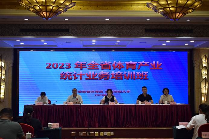 为深入贯彻落实党的二十大精神,进一步提升我省体育产业统计的实际工作能力,奋力推进我省体育产业高质量发展,由安徽省体育局主办、安徽财经大学承办的“2023年全省体育产业统计业务培训班”“2022年度安徽省居民体育消费调查工作”于9月12-13日在蚌埠市水利和顺大酒店顺利举办,省体育局经济处处长刘弢、经济处副处长朱雪梅、经济处二级主任科员盛睿、安徽财经大学体育产业管理研究院院长姜同仁、我校体育大数据研究中心主任宋述雄出席开班仪式,安徽省、省内16地市以及部分县(区)体育产业相关干部、深圳市维度数据科技股份有限公司人员共计40余人参加了此次培训。