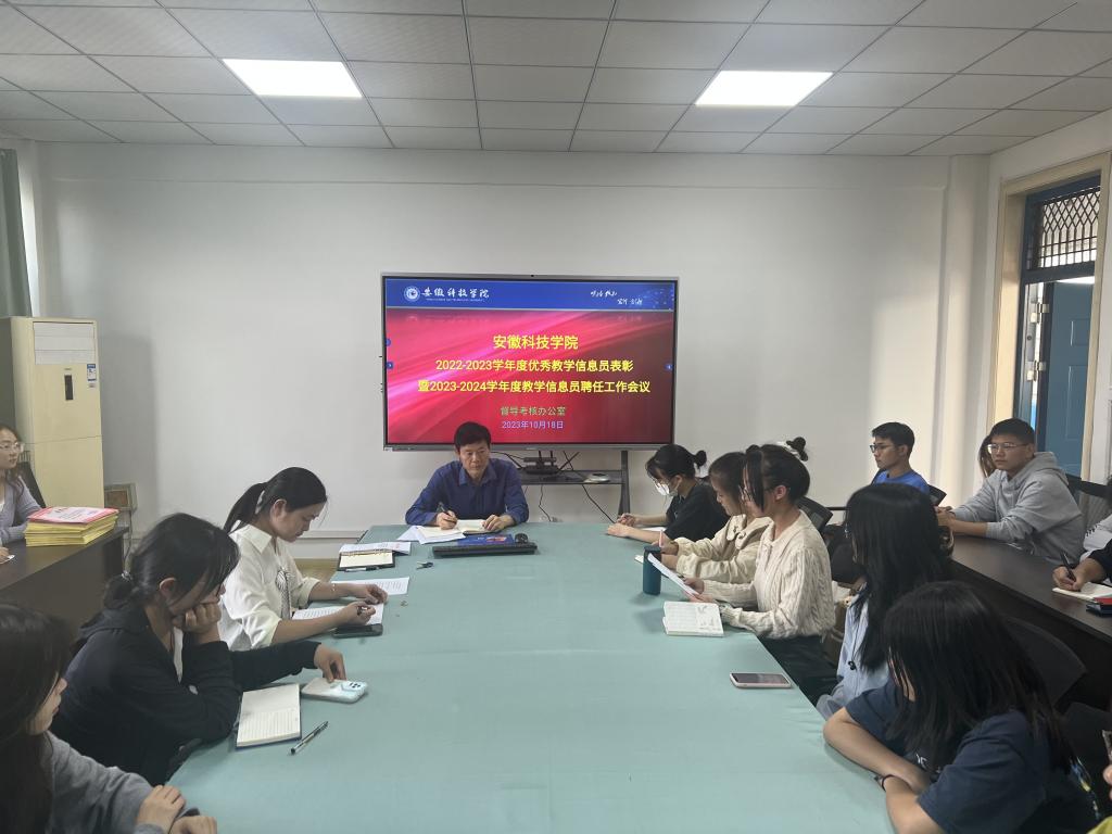 10月18日下午,督导考核办公室召开学生教学信息员工作会议,表彰2022-2023年度优秀教学信息员,聘任2023-2024年度教学信息员。督导考核办公室有关教师出席会议,各教学院(部)教学信息员代表参加会议,会议由督导考核办公室谢静静主持。