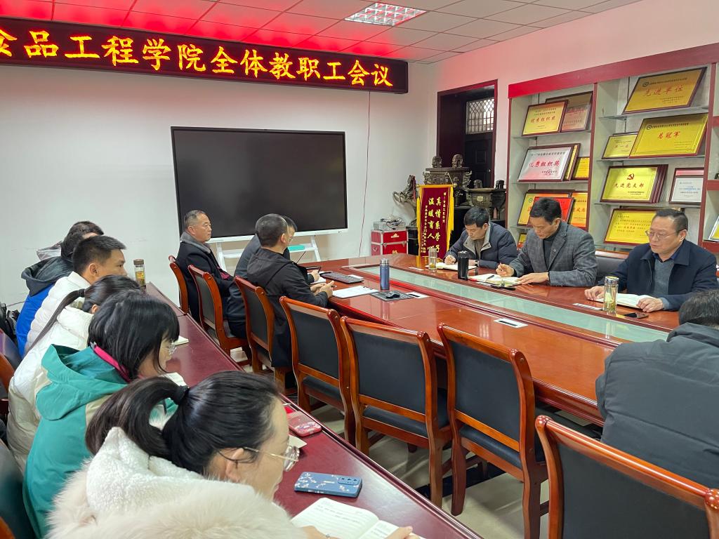 11月27日下午,食品工程学院在东办公楼104会议室召开全体教职工会议,就近期重点工作做进一步强调部署,会议由食品工程学院院长杜传来主持。