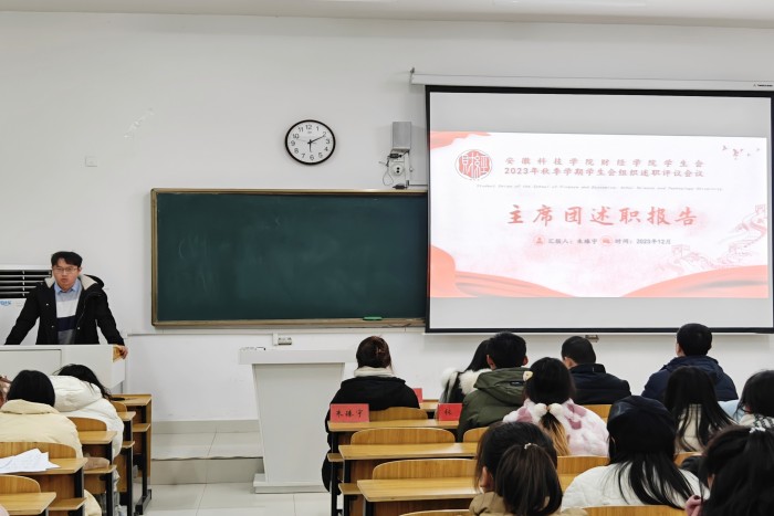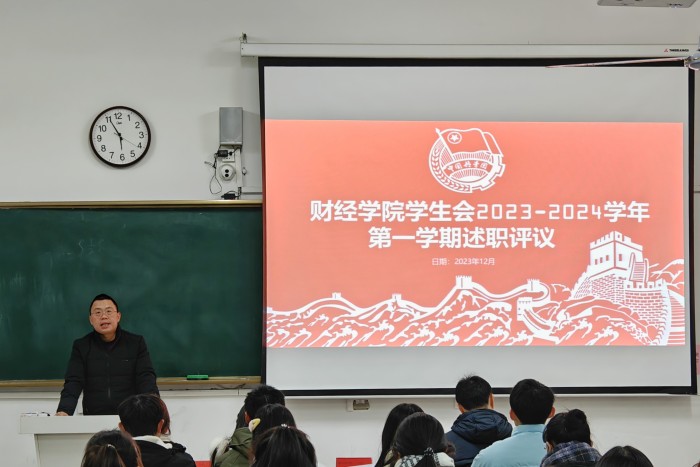 为推进学生会管理科学化、规范化,提高学生干部的服务意识和责任意识,12月21日,财经学院在致知楼B108召开学期末学生会述职评议会。学院党政领导和有关教师担任评委,学生会全体成员参加。会议由院学生会主席黄欣宇主持。