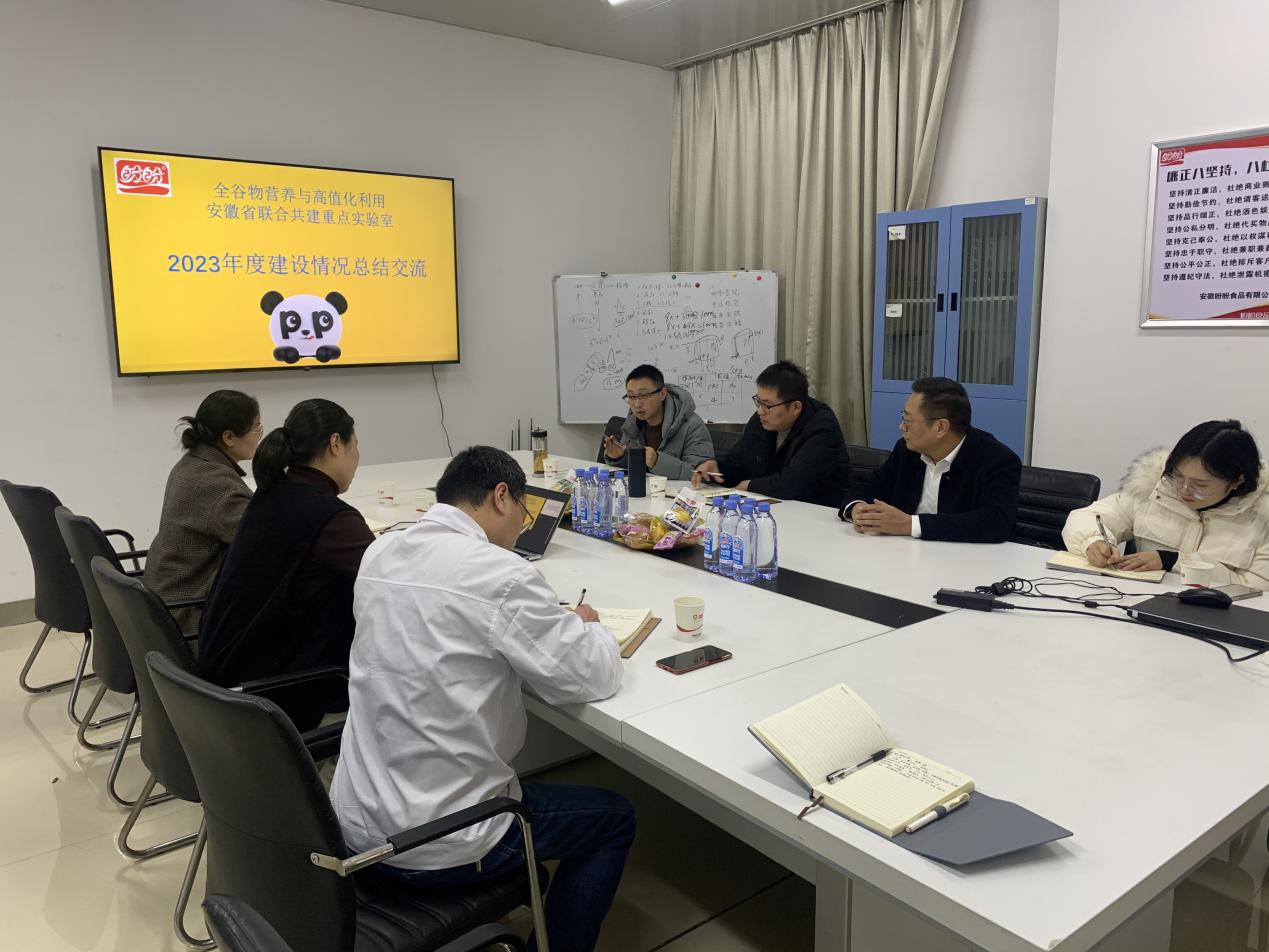 为总结全谷物营养与高值化利用安徽省联合共建学科重点实验室工作,推进重点实验室的建设,1月10日,科研处副处长刘宗飞、食品工程学院院长杜传来等一行4人前往滁州市安徽盼盼食品有限公司进行总结交流。企业品管经理谢艳、财务经理连振平、检验检测技术部经理王珊妹等相关人员热情接洽。