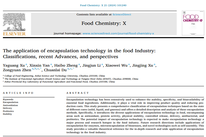 近期,我校食品工程学院动物源食品精深加工与营养团队在中国科学院农林科学领域一区期刊Food Chemistry: X(IF=6.10)在线发表题为“The Application of Encapsulation Technology in the Food Industry: Classifications, Recent Advances, and Perspectives ”的综述论文。食品工程学院2021级食品加工与安全领域硕士研究生徐亚光为第一作者,杜传来教授和甄宗圆副教授为通讯作者,华体平台为第一完成单位。