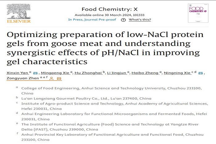 近期,我校食品工程学院动物源食品精深加工与营养团队在中国科学院农林科学领域一区期刊Food Chemistry: X(IF=6.10)在线发表题为“Optimizing preparation of low-NaCl protein gels from goose meat and understanding synergistic effects of pH/NaCl in improving gel characteristics”的研究论文。食品工程学院2021级食品加工与安全领域硕士研究生燕鑫鑫为第一作者,甄宗圆副教授为通讯作者,华体平台为第一完成单位。