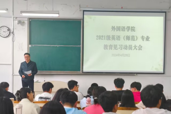 为扎实做好2021级英语(师范)专业见习工作,引导学生以良好的精神风貌迎接见习,4月29日下午,外国语学院在求知楼A203教室举行2021级英语(师范)专业教育见习启动大会。2021级英语(师范)专业全体学生参加本次会议。外国语学院党政领导和有关教师出席会议,会议由副院长洪民主持。