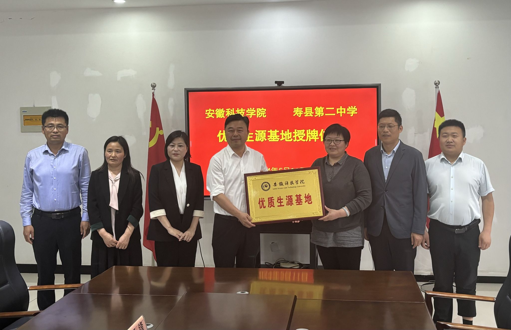 随后,谢宜勤等一行前往寿县第二中学,进行优质生源地挂牌仪式,并同与会人员进行充分交流和讨论。双方期待通过优质生源基地建设,进一步加强高校与中学合作交流,为培养更加优秀的社会需要人才而努力。