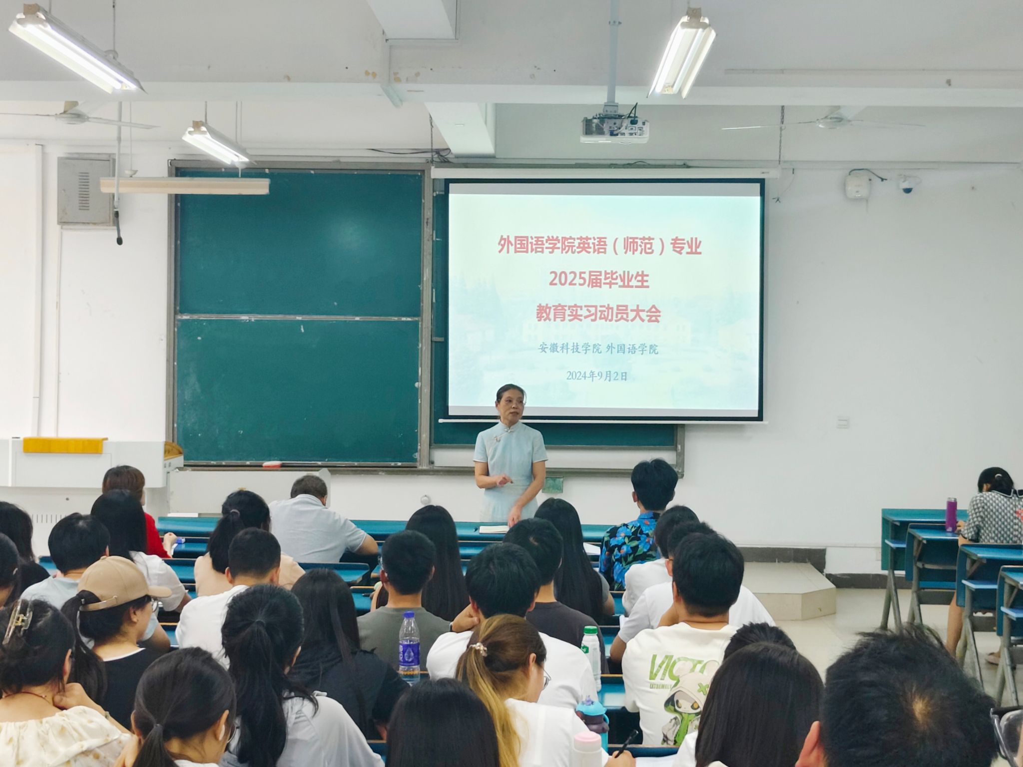 为构建师范生全方位教育实践内容体系,持续推进教育见习、实习与研习的深度贯通,9月2日下午,外国语学院在新知楼A104教室举行教育实习动员大会,2021级英语(师范)专业全体学生参加本次会议。外国语学院党政领导和有关教师出席会议,会议由副院长洪民主持。