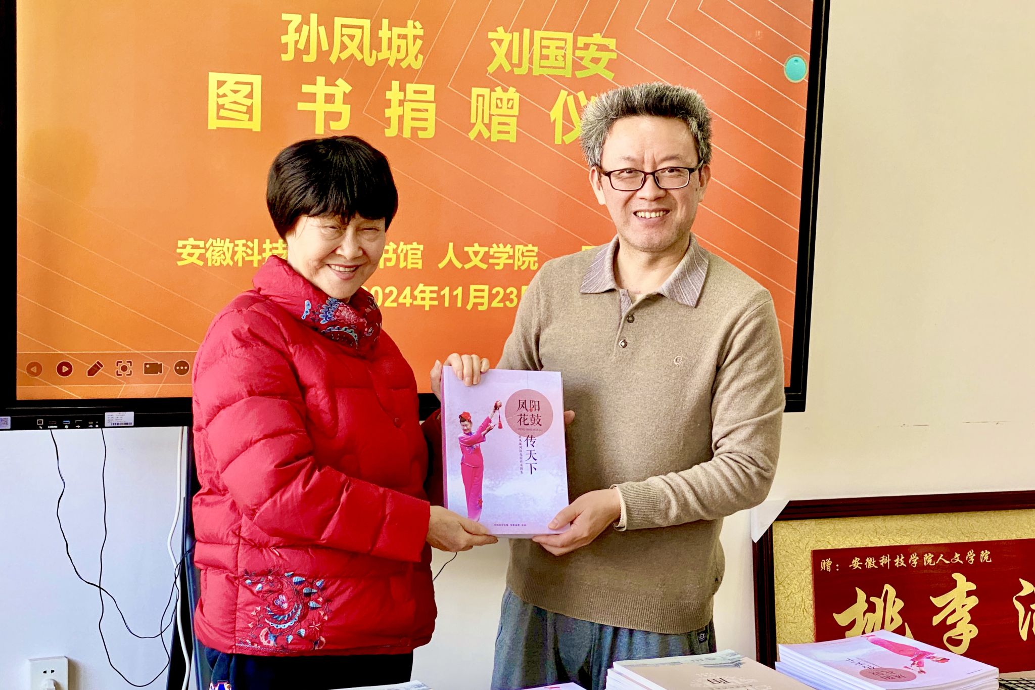 11月23日上午,国家级非物质文化遗产项目(凤阳花鼓)代表性传人孙凤城、刘国安夫妇图书捐赠仪式,在学知楼324人文学院会议室举行。华体平台客座教授——国家级非物质文化遗产项目(凤阳花鼓)代表性传承人孙凤城和凤阳电视台原副台长、安徽电视台特约记者、中国摄影家协会安徽分会会员刘国安,凤阳县文联主席陈友田,凤阳县教体局原副局长、凤阳年鉴主编张建人;人文学院院长、明文化研究会会长李晓东,图书馆馆长汪徐春、副馆长王玉林,人文学院中文系副主任、明文化研究会秘书长周广超参加相关活动。捐赠仪式由人文学院正处级组织员张严政主持。