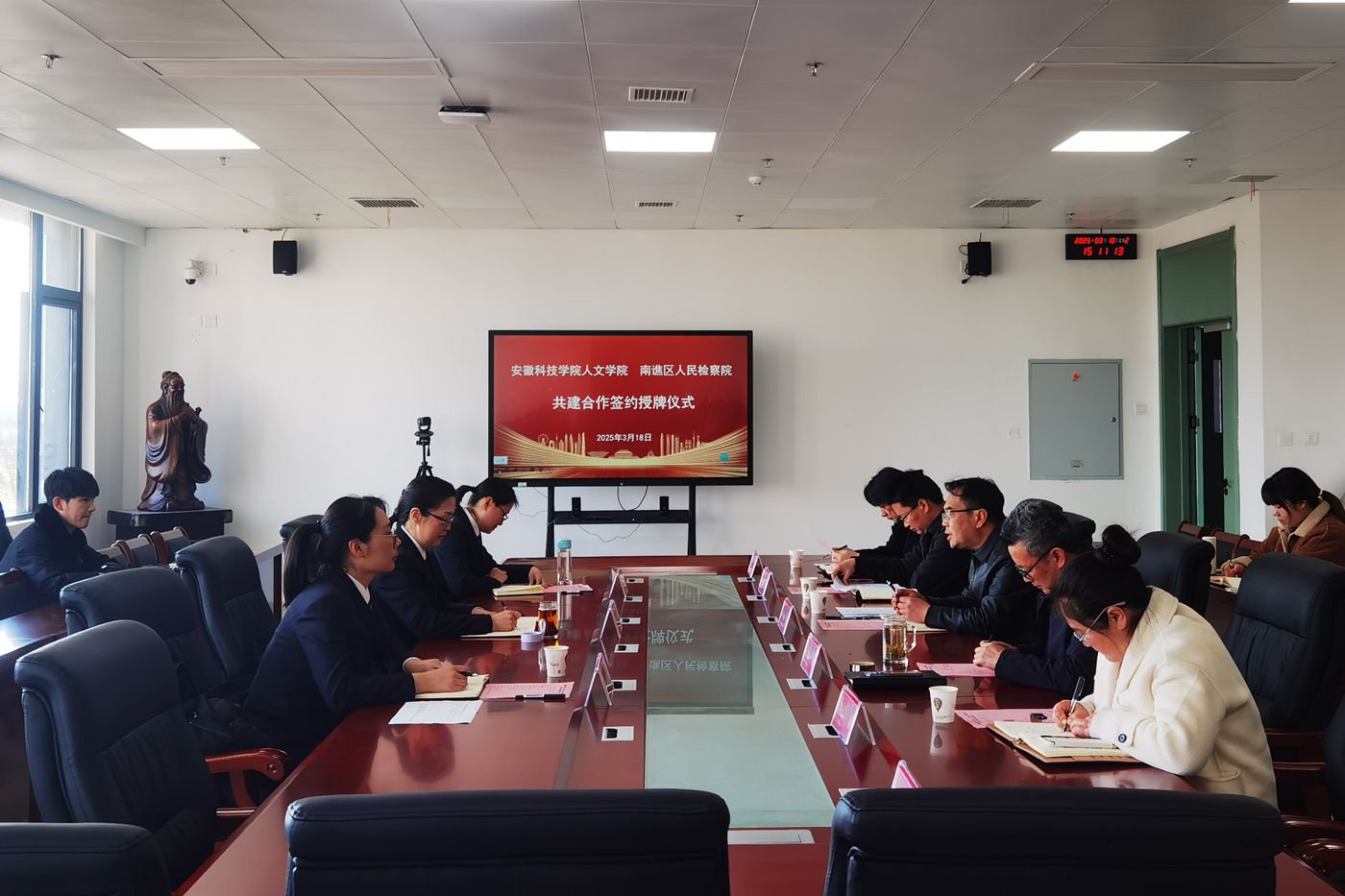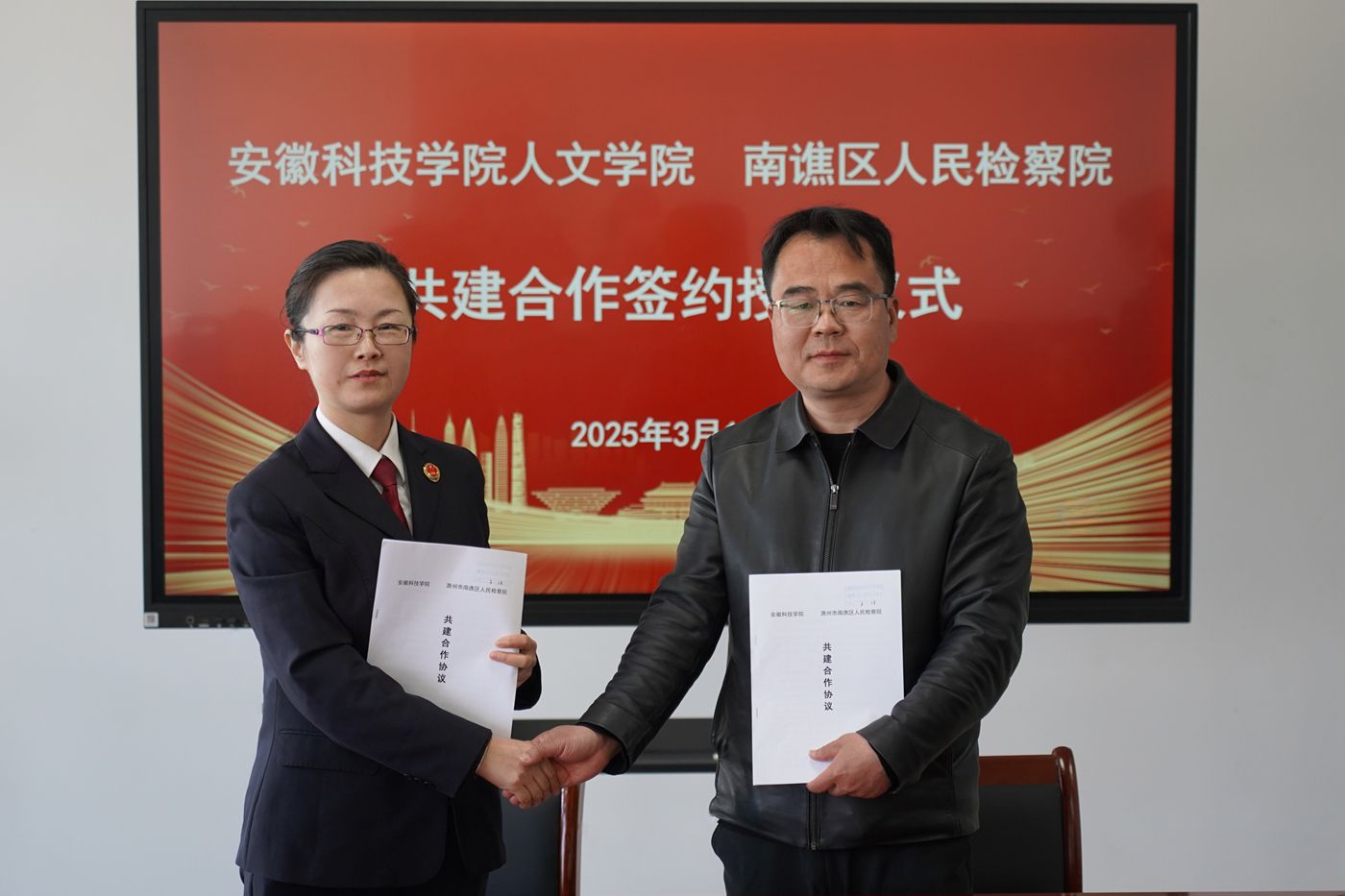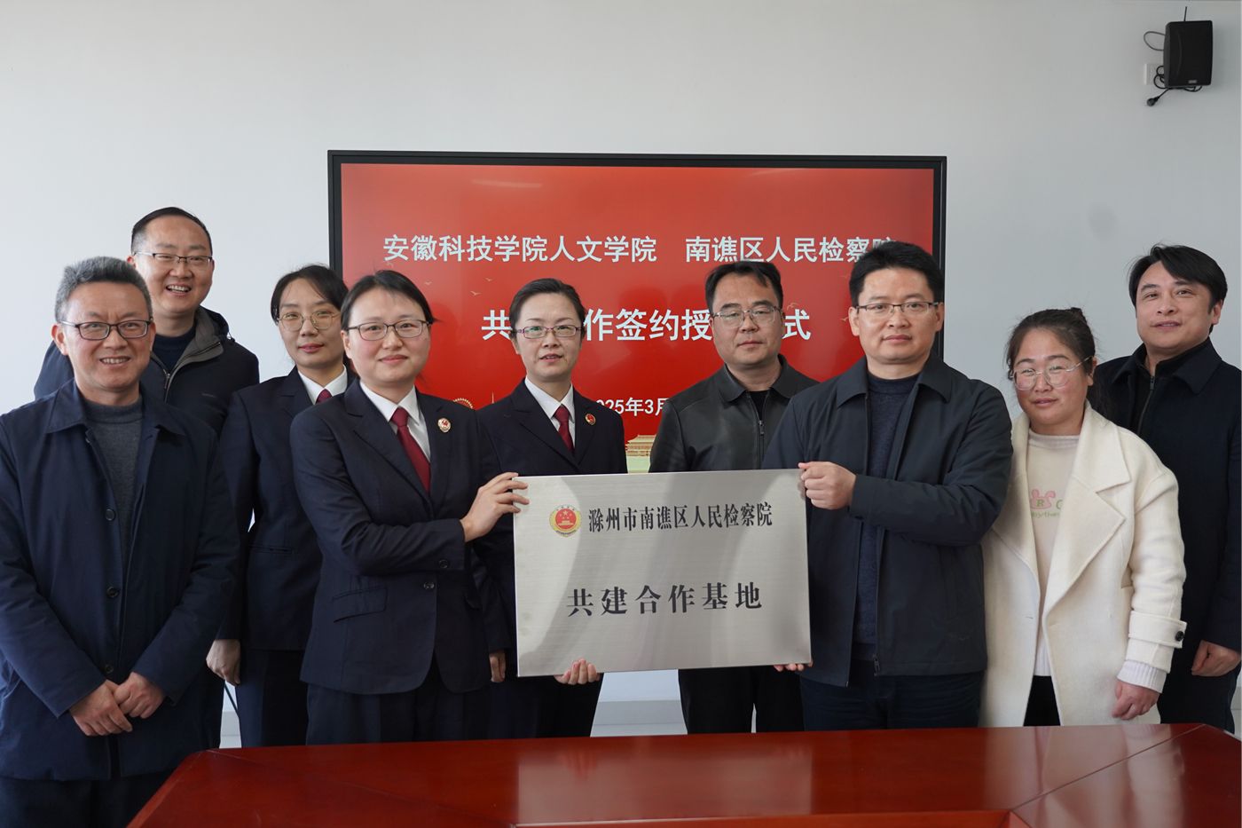 为加强法学专业实习实训基地建设,推动法学专业新文科认证,搭建人才培养单位与法律实务部门交流平台,3月18日下午,人文学院与滁州市南谯区人民检察院举行共建合作签约授牌仪式。南谯区人民检察院党组书记、检察长陈涛,副检察长钱佳,第一检察部主任张婷婷,学院党委副书记、院长李晓东,正处级组织员张严政,副院长牛永辉,党委副书记李沙娜,党委委员骆绪刚,模拟法庭主任宣刚出席,仪式由张严政主持。