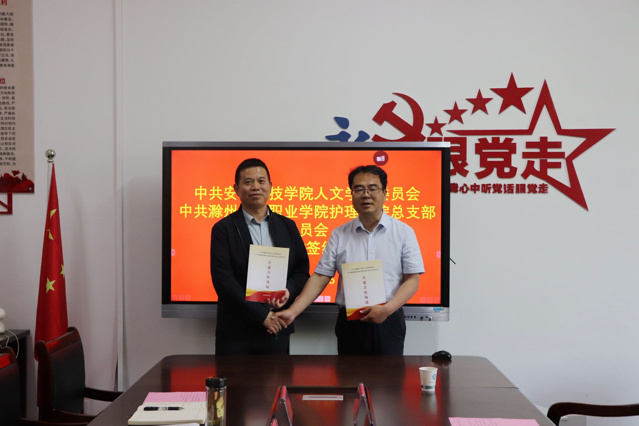 李晓东在介绍学院党建与发展工作时指出,人文学院党委作为“全省高校党建工作标杆院系”培育创建单位,始终坚持党建引领,注重发挥二级党组织在推进学院事业高质量发展过程中的政治核心作用;中文系教工党支部以立项建设全省高校“双带头人”教师党支部书记工作室和打造全省高校“双带头人”教师党支部书记“强国行”专项行动团队为契机,立足发挥党支部战斗堡垒和党员先锋模范作用,致力于推动党建工作与学科专业建设、教师队伍建设、校企合作与社会服务、文化传承与创新深度融合。与滁州城市职业学院护理学院开展多层次、多形式党建共建合作,有利于充分发挥省级党建工作标杆院系和“双带头人”教师党支部工作室的辐射带动作用,推动双方在基层党建、事业发展、社会服务、文化建设等方面实现资源共享、携手共进。