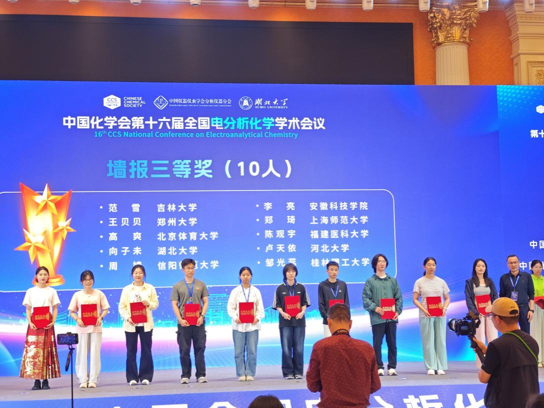 本次会议是我国分析化学领域最具影响力的学术盛会之一,旨在促进学科交叉与技术创新,汇聚了来自全国高校、科研院所及企业的千余名专家学者,围绕电分析化学领域的前沿技术、方法创新及应用研究,通过大会报告、邀请报告、口头报告、墙报等多种方式展开深入交流。经大会学术委员会专家评审,李亮的科研成果《Development of g-C3N4/Co/NC derived from hierarchical g-C3N4/ZIF-67 electrochemical sensing platform for detection of carcinogenic antioxidant》在大会数百份墙报中脱颖而出,获评大会优秀墙报三等奖。该研究聚焦于g-C3N4/Co/NC电化学传感平台的制备并用于致癌抗氧化剂的检测,其研究思路和成果得到了评审专家的一致认可。(特约通讯员:路润麟 摄影:李亮 审核:张炎 黄树桥 编辑:李锦)