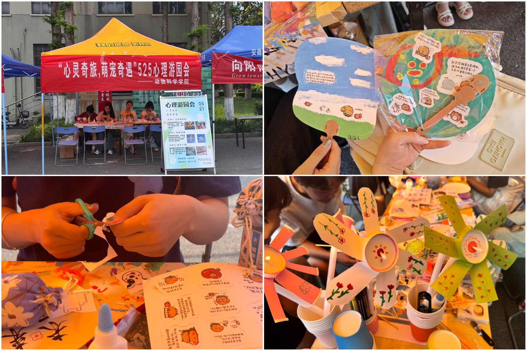 5月21日,学院在凤阳校区五四广场举办了“心灵奇旅,萌宠奇遇”主题心理游园会。活动现场精心打造了泡沫球彩绘、纸杯风车、纸片小狗等创意手工体验区,同学们专注于指尖创作,在色彩与形状的交织中舒缓压力、释放自我,尽情享受手工带来的治愈与乐趣。祝福语挂件、正能量桌面立牌等暖心小礼品,更是为活动注入温情,让欢乐与温暖在校园里悄然流淌。这场游园会不仅成为同学们放松身心、展现创意的欢乐天地,更将积极向上的生活态度传递到每个人心中,有力推动了校园心理健康文化的传播。