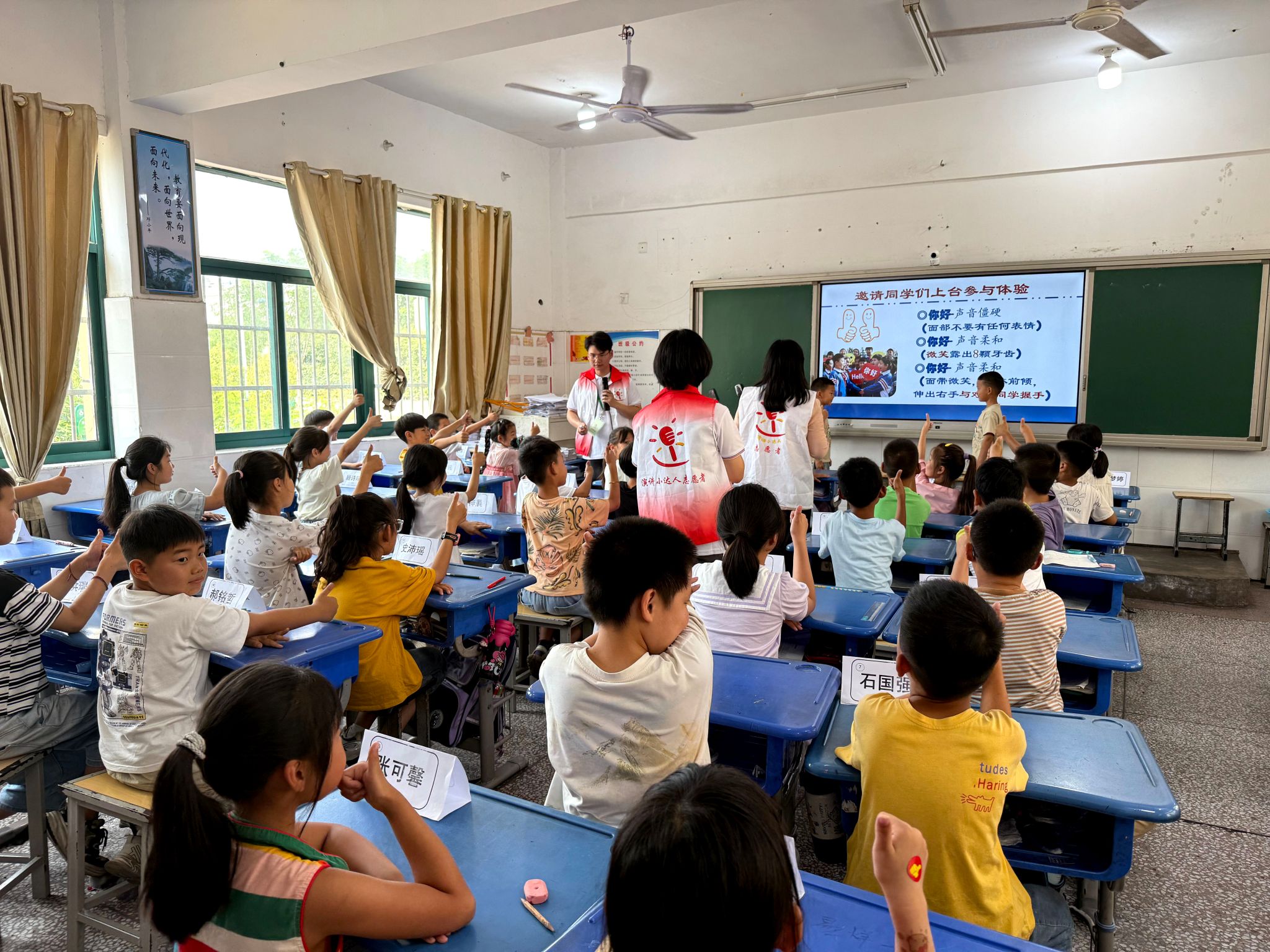 最具趣味性的“三定训练”(站定、眼定、笑定)将活动推向高潮。志愿者们通过示范标准演讲姿势、分解手势动作含义,带领孩子们在模仿与练习中感受演讲的魅力。原本腼腆的孩子们逐渐被点燃热情,主动举手参与互动,从最初的声音微弱到自信喊出“我能行”,课堂氛围愈发活跃。