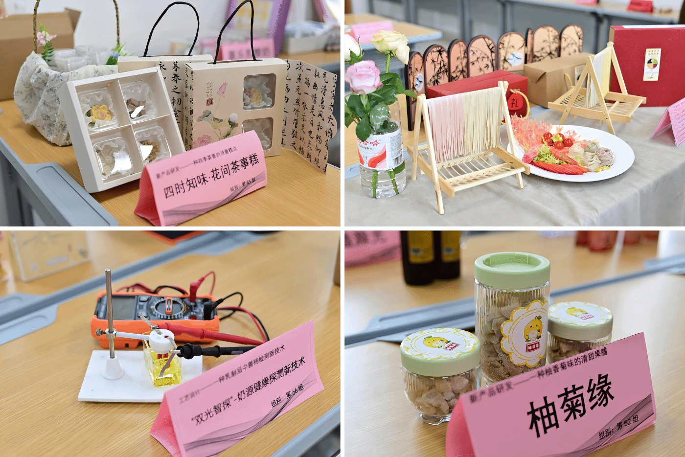 比赛现场气氛热烈,创意作品精彩纷呈。各参赛团队在展示环节中,从产品的创新点、实用性、市场潜力等方面展开阐述,充分体现出了扎实的专业素养与创新能力。各位评委认真记录,并围绕技术路线、创新要点等维度对参赛选手进行了提问。问答环节既有专业见解的深入交流,也有思维碰撞的灵感闪现,现场互动频繁,氛围融洽。产品展示室内,“淳味肉类饮料”“‘双光智探’——奶源健康探测新技术”等原创作品依次摆放,造型精美、特色鲜明,吸引了众多师生驻足欣赏拍照,现场观展氛围热烈,充分展现了同学们对此次大赛的参与热情。