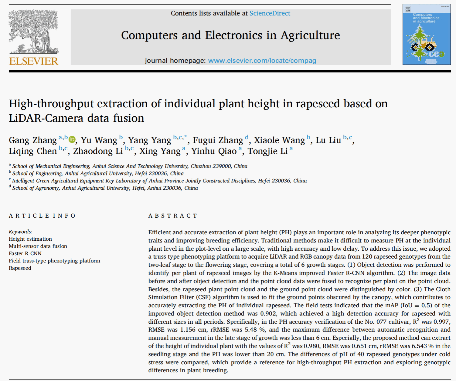 近日,我校智能制造学院教师张刚(第一单位/第一作者)在国际学术期刊《Computers and Electronics in Agriculture》(中科院1区TOP期刊(农林科学),IF:7.367)上发表了题为《High-throughput extraction of individual plant height in rapeseed based on LiDAR-Camera data fusion》的研究论文。该研究提出了一种基于雷达与相机数据融合的高通量油菜个体株高提取方法,实现了从两叶期至开花期多生长阶段下油菜株高的精准、高效测量,为作物育种表型分析提供了可靠的技术支撑。合作单位为安徽农业大学,研究得到了国家自然科学基金(32372003)、安徽省教育厅优秀青年人才项目(2022AH030090)、华体平台横向科研项目(881709)等资助。