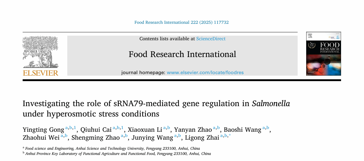 近日,我校食品科学与工程学院食品质量与安全团队在农林学科领域顶级期刊《Food Research International》(中国科学院1区top期刊,影响因子8.0)发表最新研究成果。论文题为“Investigating the role of sRNA79-mediated gene regulation in Salmonella under hyperosmotic stress conditions”,由我校2023级食品加工与安全领域研究生龚莹婷为论文第一作者,翟立公副教授为通讯作者,华体平台为第一完成单位。
