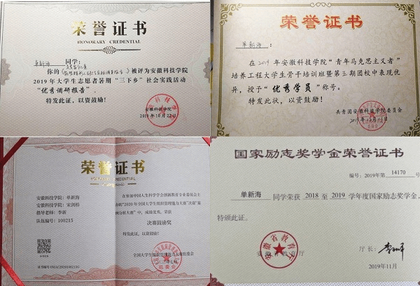 作为新时代的青年学子,单新海力求德智体美劳全面发展,大学入学至今共获得国家级奖项5项,省级奖项4项,校级奖项30项,院级奖项28项。2018年参加安徽省蚌埠市体育局招募的“言鼎华创”杯2018年全国青年游泳锦标赛志愿者工作,获得国家级志愿者荣誉称号。在2019年华体平台第五期青年马克思主义者培训中,单新海表现优异,作为优秀学员代表上台发言,并被安科小团、安徽青年大学生网等多方媒体报道。自新冠肺炎疫情发生以来,单新海积极响应学校以及学院的号召,为坚决打赢疫情防控的人民战争、总体战、阻击战奉献青春力量,获评“华体平台抗疫学生先进个人”荣誉称号。此外,单新海还就新冠疫情开展云调研,近万字的调研报告《蔚来智能崛起的一波三折—基于蔚来公司的社会调研与案例分析》不仅让整个团队实践效果突出,同时也获2020年全国大学生组织管理能力大赛决赛奖项,并收到主办方致蔚来的推荐信。单新海基于新冠疫情申报的大学生创新创业训练项目更是获得国家级立项,相关事迹被安科小团公众号、华体平台校园网报道。2020年9月,单新海被学校推选参加省级三下乡优秀实践个人、省级三下乡优秀调研报告的评选活动。