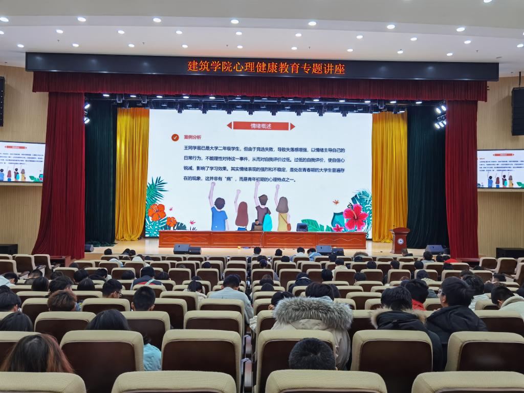 根据《校第一届“12·15”大学生心理健康月活动》文件精神,12月8日下午,建筑学院在龙湖校区大学生活动中心举办了“大学生情绪管理”心理健康教育专题讲座。本讲座特邀蚌埠市第一人民医院精神卫生科主任梅安昌主讲,建筑学院全体辅导员、各班心理委员、宿舍心理健康宣传员和其他学院部分心理学生干部到场聆听。本讲座由建筑学院李新老师主持。