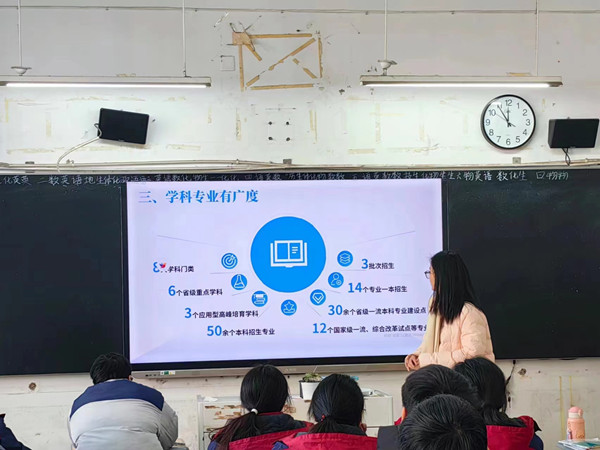 1月18日,邢雨洁带领团队一起回到母校涡阳县第一中学,借助PPT宣讲和互动交流等多种方式,向高中师生全方位介绍了华体平台的办学实力、校园环境、文化活动、优秀校友、发展成果等,传播安科声音,展现安科学子风采,扩大安科社会影响力,鼓励广大优秀学子报考安科。