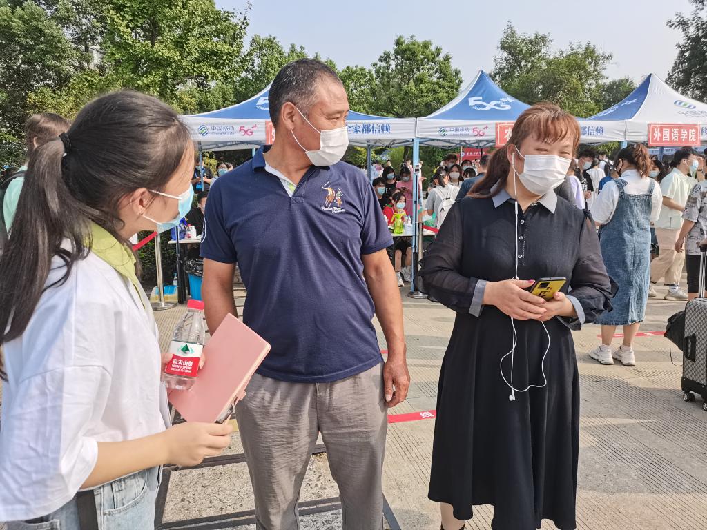 笔者采访时遇到了一对父母,因一路的长途跋涉脸上疲态尽显,但在被问到送孩子上大学的感受时,他们的脸上只剩下欣慰的笑容:“孩子长大了,考上大学了,读书才有出路,只希望他们多努力,拼出更好的未来。”说完,表情突然有些失落。两位家长顿了顿,接着又道:“孩子也是第一次离家这么远,当时在家的时候挺担心的。送他来之后才发现学校环境挺好的,也有这么多老师学长学姐帮忙,也就放心了,只希望孩子能在这里快乐地生活和学习。”也有家长认为,陪同孩子上大学会让孩子依赖父母,因此他们虽然陪同孩子报到入学,但不会干涉太多事务,更多是来见见老师,了解孩子即将生活四年的大学校园。消杀通道外,在看着女儿走进校园后,一位父亲突然冲上前去拉着她的手嘱咐道:“在学校要好好吃饭、不要减肥,身体要紧,学习要跟上,在学校都要好好的。”都说父爱如山,爱得深沉。这就是最好的证明。