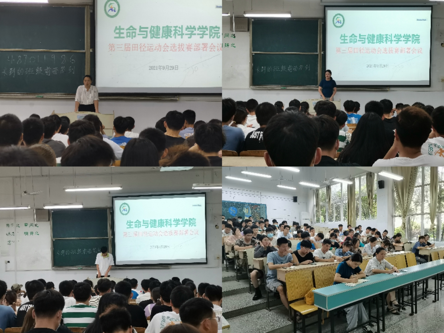 为安排部署学院第三届田径运动会选拔赛各项事宜,9月29日中午,生命与健康科学学院在求知楼A101教室召开第三届田径运动会选拔赛部署会议。学院党委副书记彭丽萍,团委副书记姜毅出席本次会议,19、20、21级各班班长、体育委员或班级临时负责人,学生会主席团成员及文体部负责人到场参与会议。此次会议由文体部负责人章杰主持。