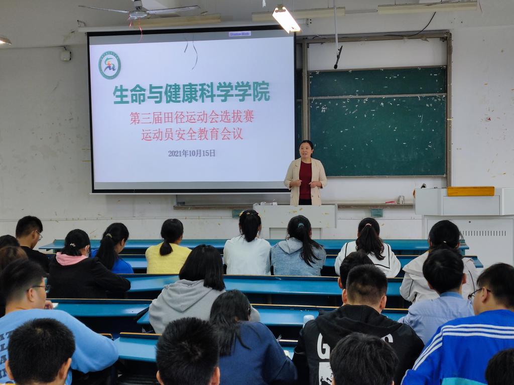 为提高参赛运动员的安全意识,有效防范活动中安全事故发生,10月15日中午,生命与健康科学学院于新知楼B304召开第三届田径运动会选拔赛运动员安全教育会议。学院党委副书记彭丽萍出席会议,19、20、21级各班级负责人、领队、运动员代表以及学生会部分成员参加会议。会议由学生会主席胡康主持。