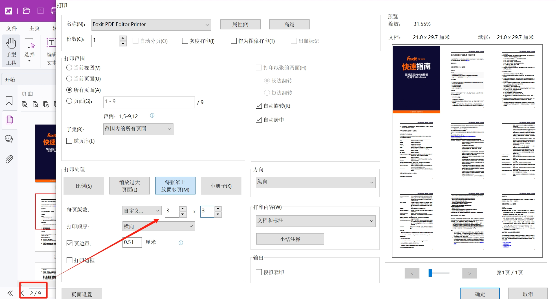 如果需要将所有页面打印在同一张纸上,我们可以根据文件的页数,来调整每页版数即可。如图所示,一共有9页,都放置在一张纸上可以在打印范围选择所有页面,每页版数选择3*3。