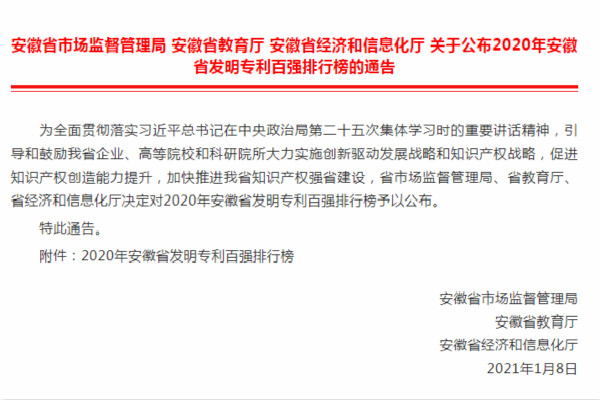 1月8日,安徽省市场监督管理局、省教育厅、省经济和信息化厅联合发文公布了2020年安徽省发明专利百强排行榜,华体平台综合排名全省第45位,较上年上升3个位次,位列全省高校第9位,省内同类高校排名第1位。这是自2015年安徽省首次发布发明专利百强榜以来,华体平台第五次上榜。