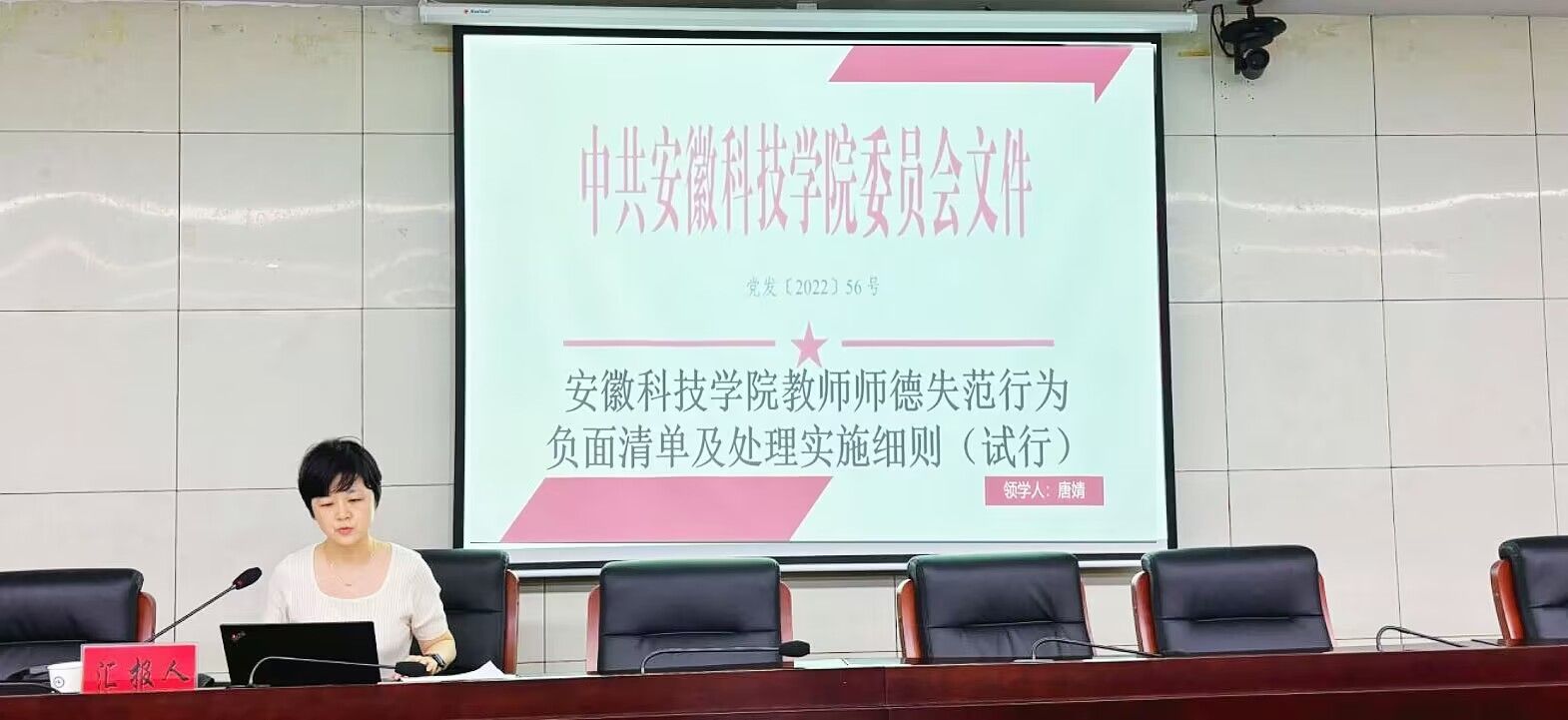 会上,唐婧详细讲解了十七条高校教师职业行为负面清单并结合具体案例介绍师德失范行为处理方式以及后续师德考核事宜。她指出高校教师职业行为负面清单是教师教学活动的“雷区”,各位教师要守住“底线”,不越“红线”,做到高度重视且时刻自省,深入落实立德树人根本任务,进一步敲响“守师德、守纪律”的警钟。