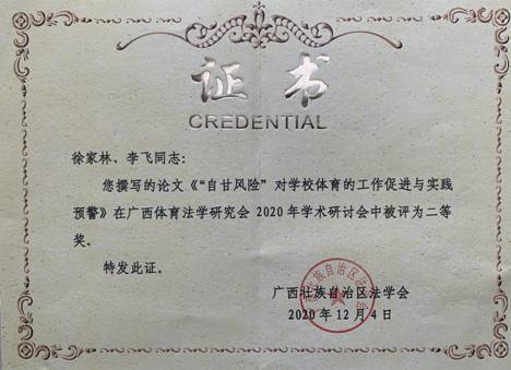 研讨会期间,各专家学者围绕会议主题“新时代体育法学理论与实践”展开了深入讨论。我校徐家林老师作了题为《“自甘风险”对学校体育的工作促进与实践预警》的主题发言,对“自甘风险”的构成要件与规则内涵进行了深入解读,从有利于推动学校体育工作常态化、内容全面化、赛事组织规范化等方面提出“自甘风险”条款对学校体育工作的促进作用,从认识偏差、司法滥用和消极规避等方面论述了“自甘风险”在学校体育中的实践预警,得到了与会专家学者的肯定和高度评价,并荣获二等奖。