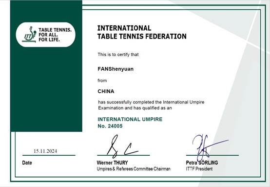 11月18日,国际乒联网站公布了2024年乒乓球国际级裁判员考试结果,我校体育教学部教师樊申元顺利通过了此次考试,获得乒乓球国际级裁判员资格证书,是我校第一位取得国际级裁判员资格的体育教师,也是众多的中国考生中唯一一位满分通过的人员,为学校争得了荣誉。