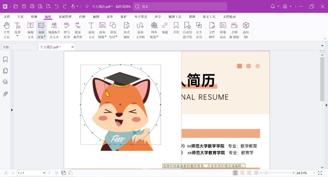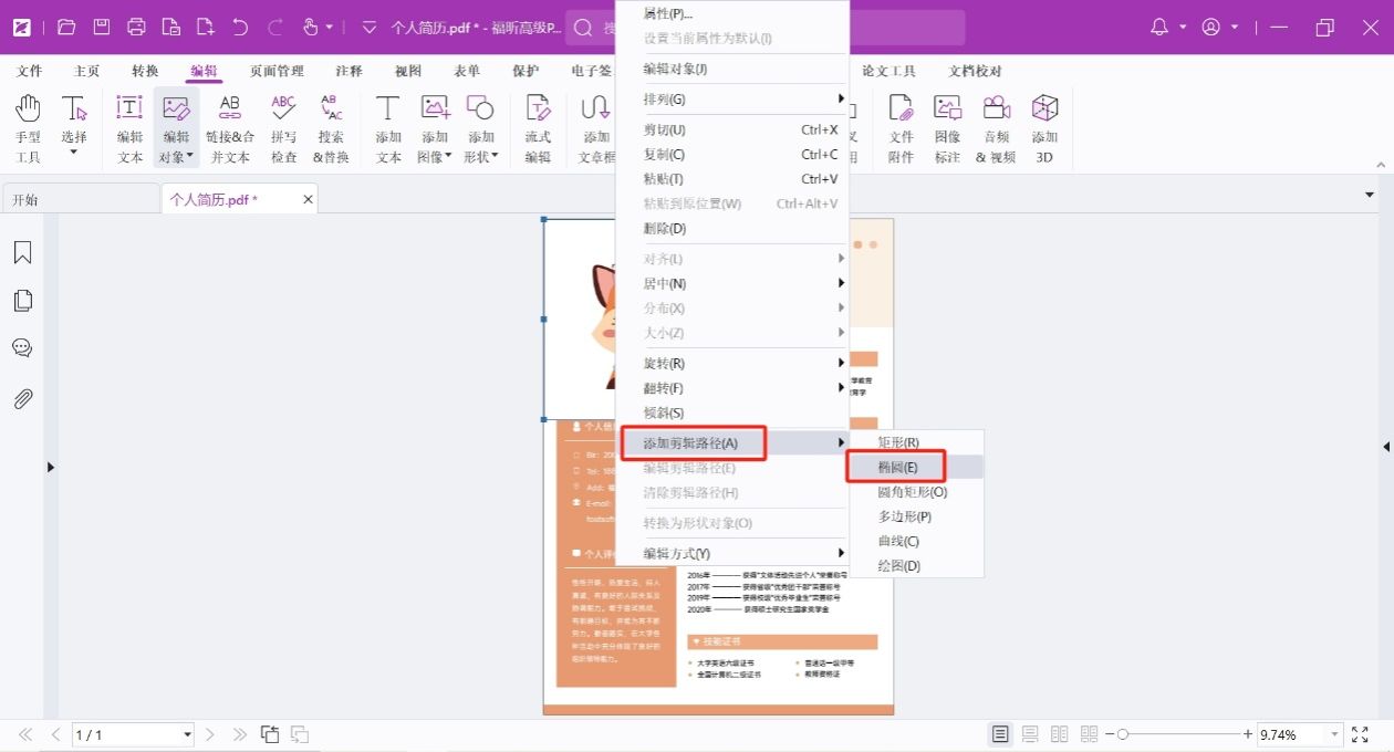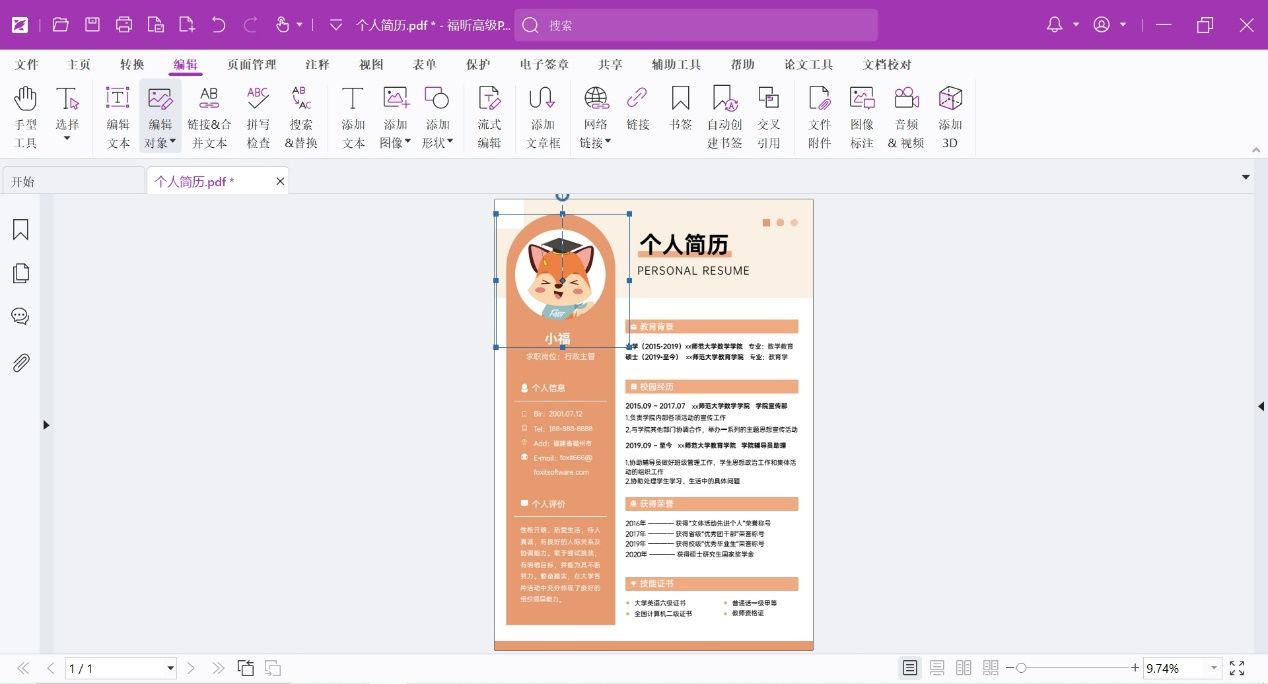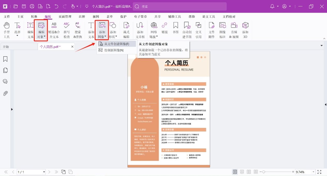 我们利用福昕高级PDF编辑器打开一份文档,比如这份简历,我们想做一个圆形的头像,我们可以点击“编辑”>“添加图像”>“从文件创建图像”,然后选择一张头像导入文档中。