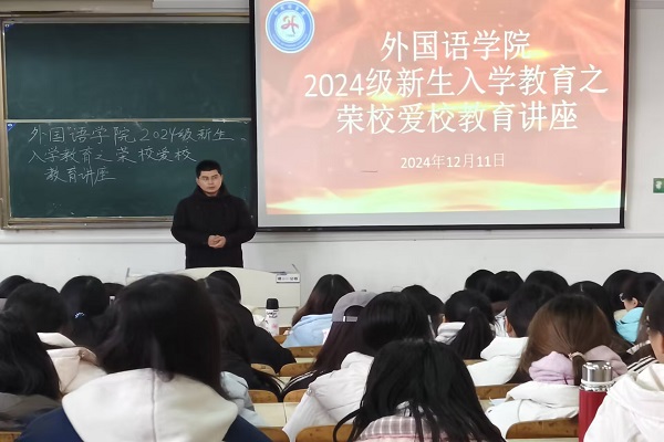 为加深学生对学校的认同,与学校发展同向而行,12月11日下午,外国语学院在求知楼A座207教室开展2024级新生入学教育之爱校荣校讲座。本次讲座由学院团委副书记宋兵兵主讲。