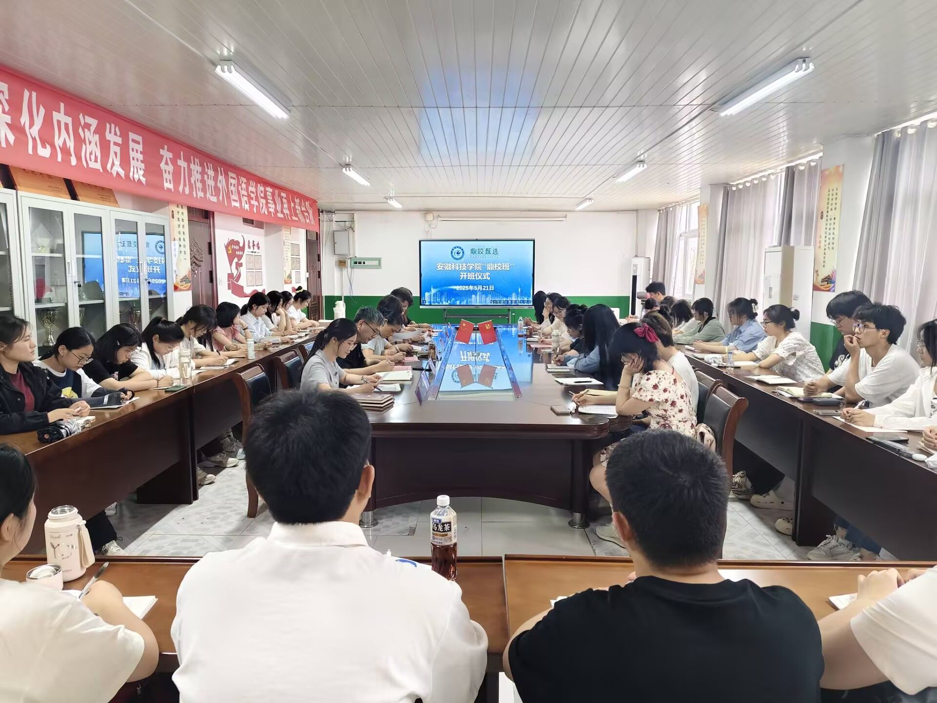 5月21日下午,华体平台“鼎校班”开班仪式在学院会议室举行。外国语学院党政领导、安徽鼎校教育科技有限公司(以下简称“鼎校教育”)相关负责人以及“鼎校班”40名学员参与活动。开班仪式由学院党委副书记张海亮主持。