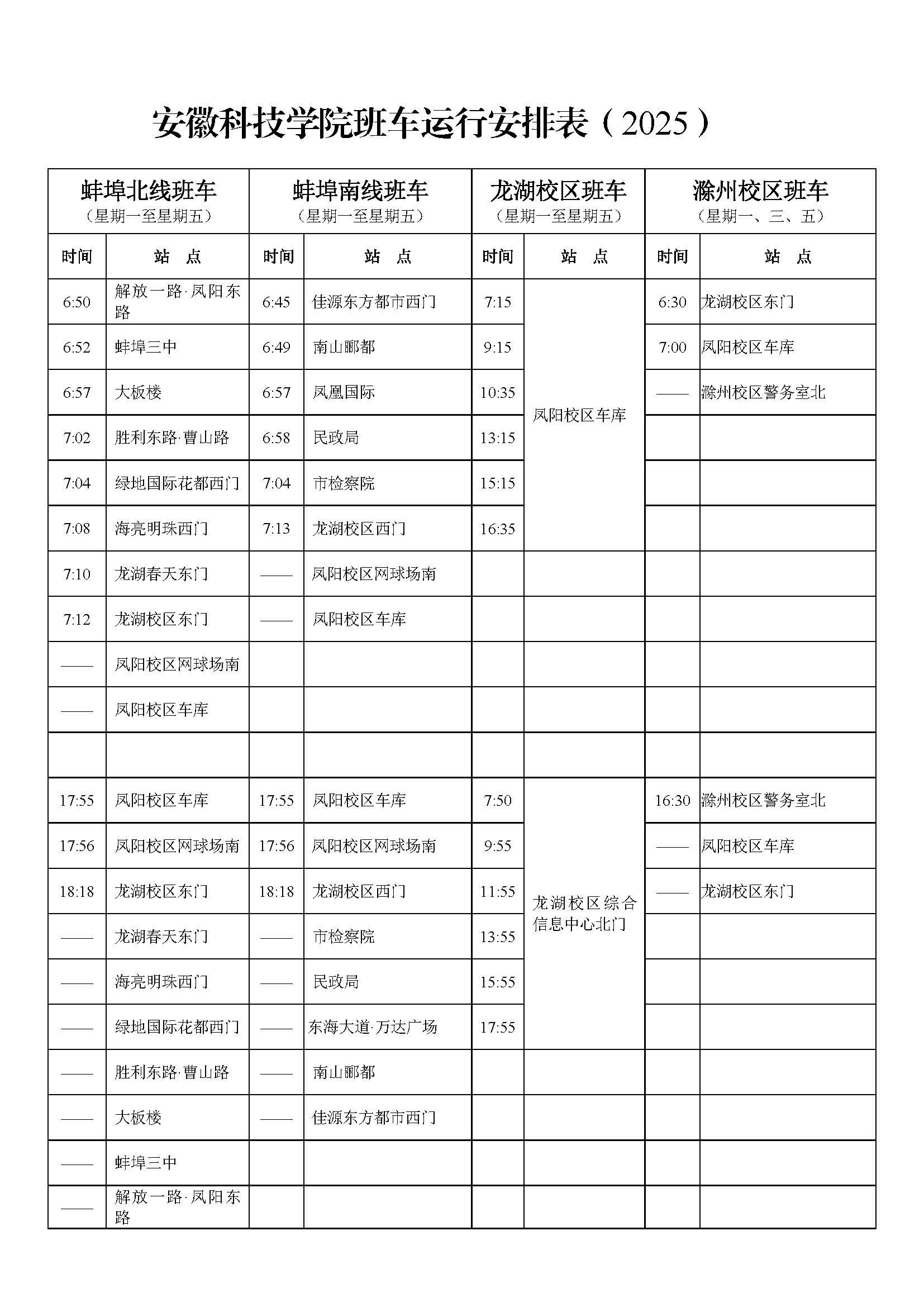 (一)蚌埠南、北线班车各站点按《华体平台班车运行安排表(2025)》早上推迟15分钟发车,晚上提前10分钟发车;