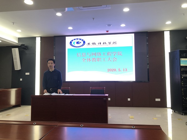 5月13日下午,信息与网络工程学院在西辅楼111召开全体教职工大会,总结2019年学院工作、部署近期重点工作、统筹规划2020年学院建设与发展,会议由副院长余宏杰主持。