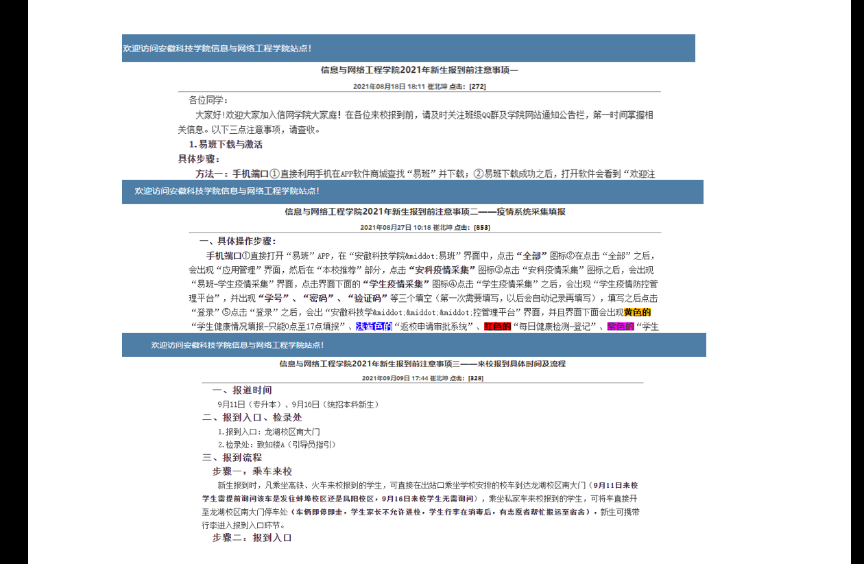 据悉,目前三篇注意事项的通知,网络点击量已达1000多次,仅“信息与网络工程学院2021年新生报到前注意事项二——疫情系统采集填报”一篇的点击量已达800多次。2021级的新同学通过学院的官网提前了解了学校学院,通过辅导员和学生党员的教育引导树立了新的目标,做好了来校前的各项准备,为他们即将展开的大学生活打下了坚实的基础。(特约通讯员:李军成 审核:韦乃学)