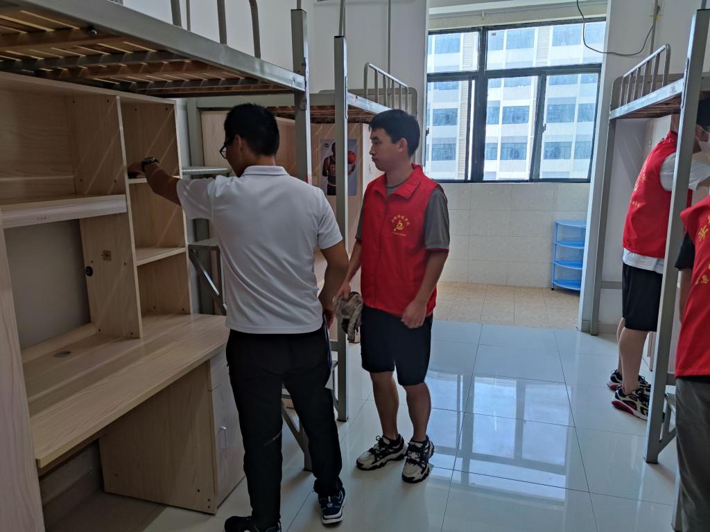活动由学生党支部书记陈凯、李军成、崔北坤老师带队,深入新生宿舍,逐一清查规整新生宿舍,检查设施,打扫卫生。大家分工明确,热情积极,不怕脏,不怕累,不放过任何卫生死角,以饱满的热情和爱心,共同创造干净整洁舒适的住宿环境。