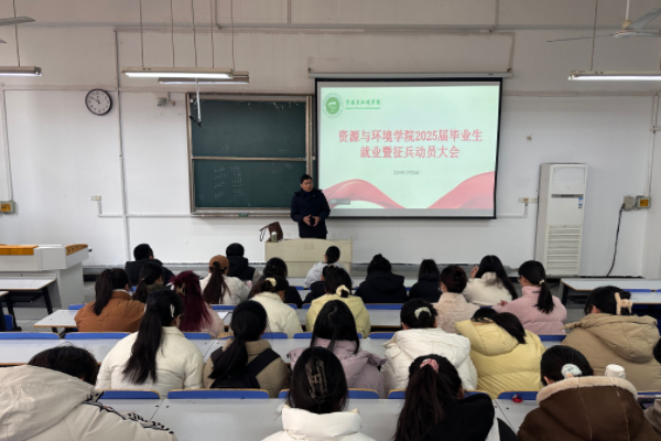 为切实做好2025届毕业生就业和应征入伍工作,引导毕业生及早树立正确的择业观和就业观,引导有志青年应征入伍,报效祖国。12月25日中午,资源与环境学院在求知楼A106教室召开2025届毕业生就业暨征兵动员大会。学院党委书记沈树周、党政办主任吴国良、就业联系人王丽萍、征兵联系人孙正浩及2025届全体毕业生参加会议,会议由吴国良主持。