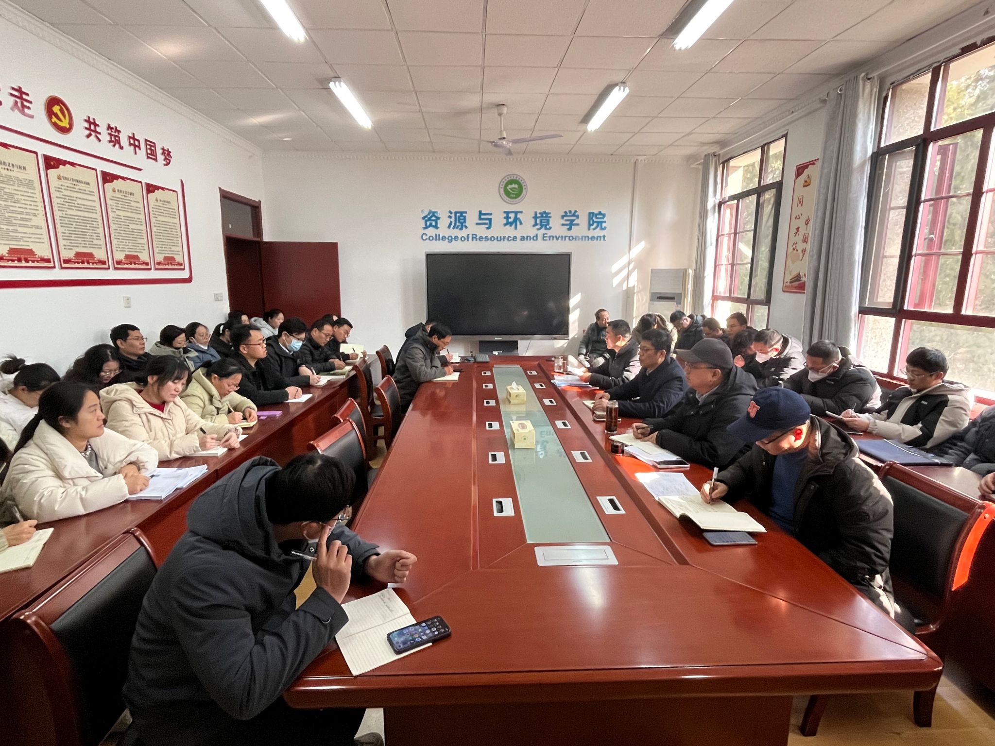 215日下午,资源与环境学院学院会议室召开春季期初教工大会,布置新学期重点工作。学院党政领导及全体教职工参加会议,会议由学院党委书记沈树周主持。