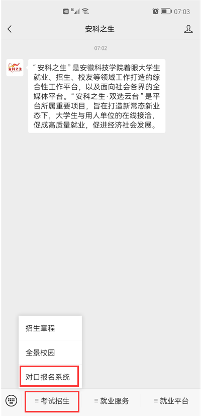 第一步:请扫描下方二维码,关注华体平台招生办公室官方微信公众号“安科之生”,选择“考试招生”菜单,点击“对口报名系统”。