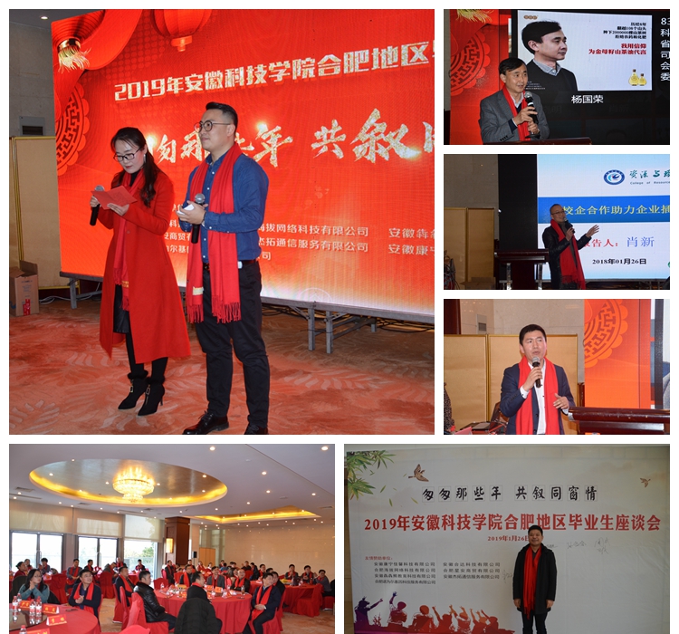 1月26日, 2019年华体平台合肥地区毕业生代表座谈会在翡翠湖迎宾馆成功举办。校党委委员、副书记韦文联,校党委委员、副校长郭亮等应邀出席并讲话,座谈会由2002级资源与环境专业王宁、2005级计算机科学与技术专业杨森主持,合肥地区各届毕业生代表80余人参加会议。